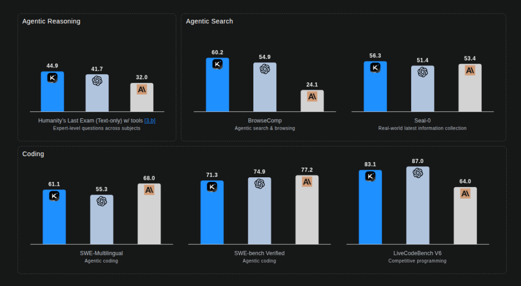 在一个涵盖超过 100 个学科的数千个专家级问题的HLE测试中,K2 Thinking 使用工具(搜索、Python、网页浏览)取得了 44.9% 的成绩,显著优于其他模型。